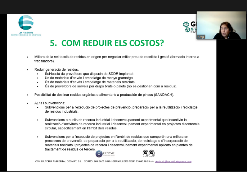 Durant "l’esmorzar" on-line, la Sílvia Mesas, gerent de la consultora ambiental GESMAT de Granollers, va compartir amb les persones assistents aspectes relacionats amb la gestió dels residus a les indústries que cal tenir en compte no només pel que fa als requisits de productors i gestors per ajustar-se a la normativa, si no també per incorporar criteris d’eficiència i sostenibilitat.