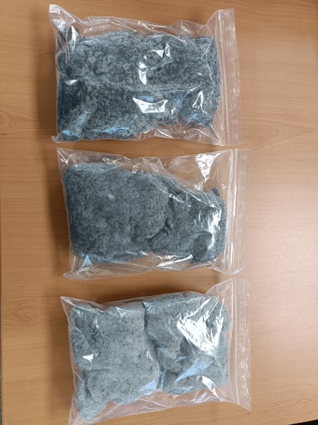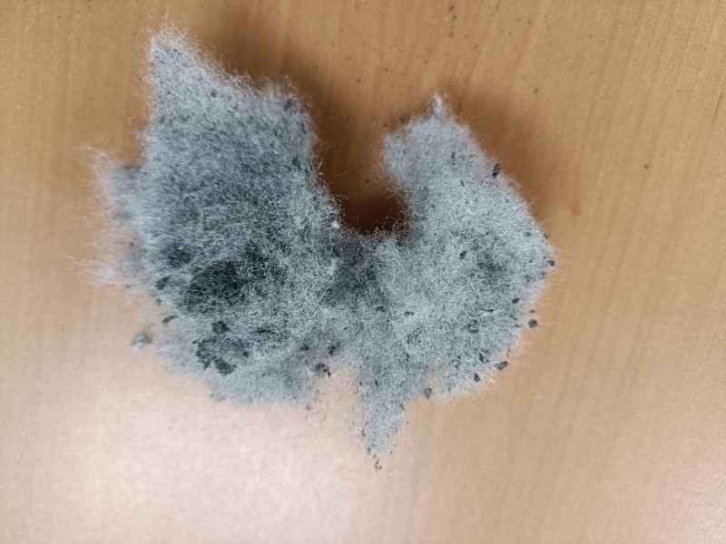 Fibra provinent d'una malla tèxtil de polièster en format esponjós. Conté restes de PVC flexible en partícules inferiors a 2mm.