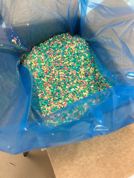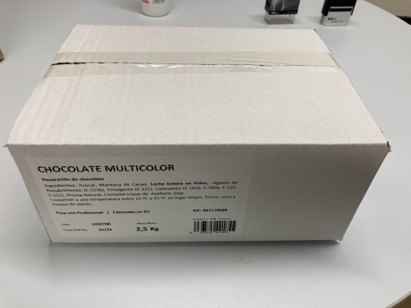 100 kg de xocolata de colors en troçets, envasats en caixes de 2,5 kg cada una (40 caixes), per decoracions de pastissos, gelats, iogurts, snacks, etc. Caducitat gener del 2023.