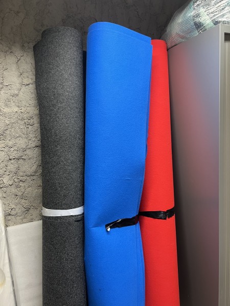 Moqueta firal negre, vermella i blava. El material està com nou i es pot proveir en grans quantitats.