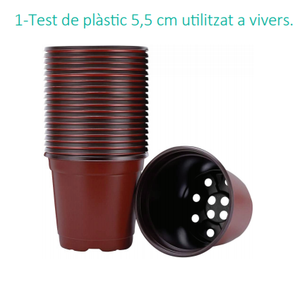 Dues mides de testos de plàstic de 5,5 cm i 14 cm de diàmetre respectivamen, de pes lleuger. Els petits són adequats per a la plantació de llavors, plàntules i esqueixos. Els grans per com a testos de transició de plantes. El fons dels testos té petits forats per a permetre el drenatge i ventilació de la terra.