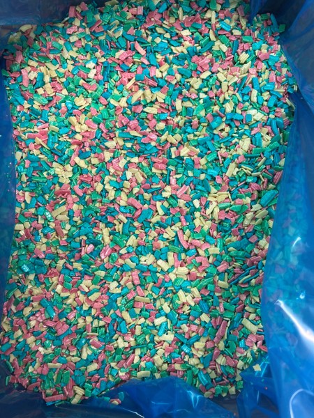 100 kg de xocolata de colors en troçets, envasats en caixes de 2,5 kg cada una (40 caixes), per decoracions de pastissos, gelats, iogurts, snacks, etc. Caducitat gener del 2023.